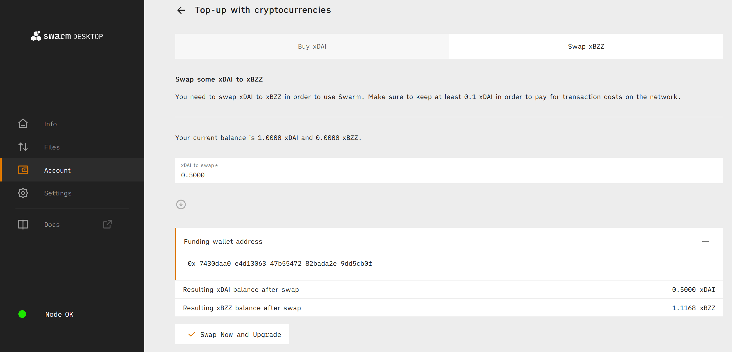 Bee ultra-light nodes are limited to only downloading small amounts of data from Swarm. In order to download greater amounts of data or to upload data to Swarm you must upgrade to a light node. To do this we need to first fund our Swarm Desktop Bee node with some xDAI (DAI bridged from Ethereum to Gnosis Chain which serves as Gnosis Chain's native token for paying transaction fees) in order to pay for the Gnosis Chain transactions required for setting up a light node.